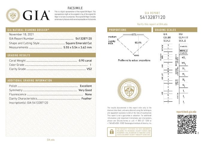 | 0.90 | Asscher | I | VS2 | GIA | 65.4 | 67 | 5.55x5.54x3.62 | Contact Vendor |