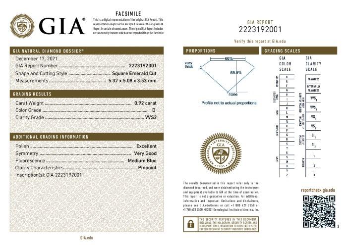 | 0.92 | Asscher | D | VVS2 | GIA | 69.5 | 66 | 5.32x5.08x3.53 | Contact Vendor |