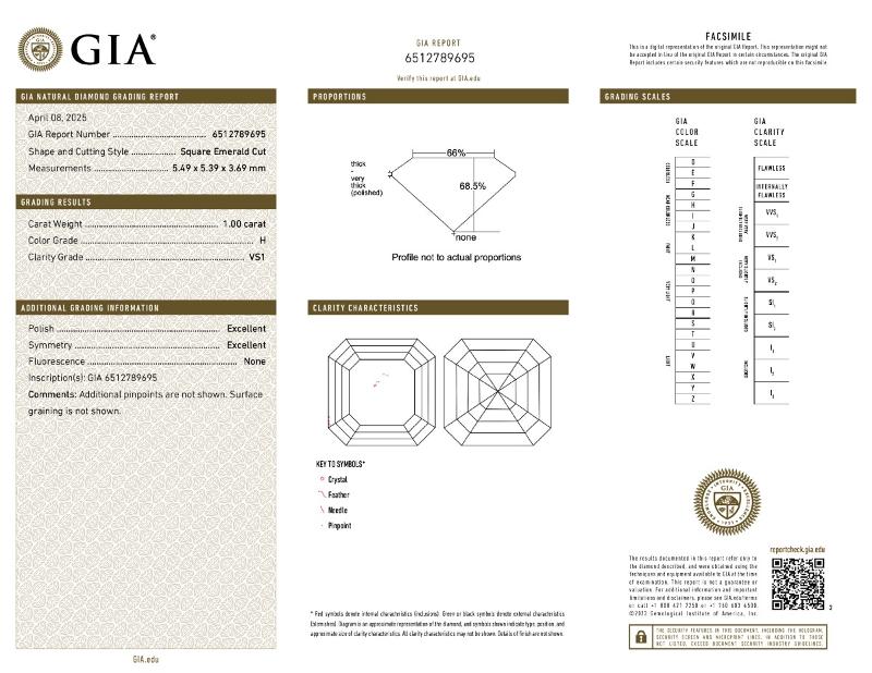 | 1.00 | Asscher | H | VS1 | GIA | 68.5 | 66 | 5.49x5.39x3.69 | Contact Vendor |