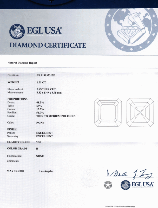 | 1.01 | Asscher | H | VS1 | EGLUSA | 68.3 | 68 | 5.52x5.49x3.75 | Contact Vendor |