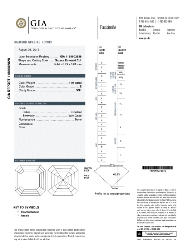 | 1.01 | Asscher | F | VS1 | GIA | 67.2 | 67 | 5.41x5.37x3.61 | Contact Vendor |