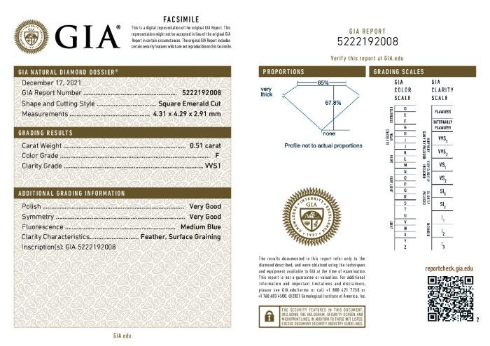 | 0.51 | Asscher | G | VVS2 | GIA | 67.6 | 65 | 4.46x4.38x2.96 | Contact Vendor |