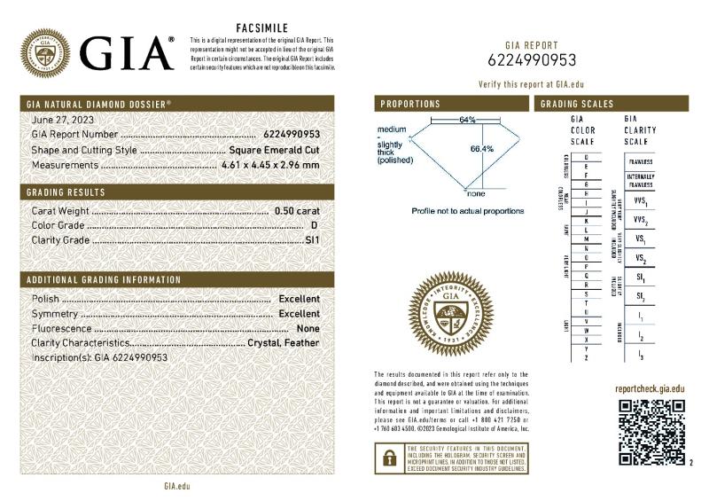 | 0.50 | Asscher | D | SI1 | GIA | 66.4 | 64 | 4.61x4.45x2.96 | Contact Vendor |