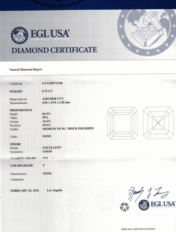 | 0.73 | Asscher | F | VS1 | EGLUSA | 66.4 | 59 | 4.96x4.94x3.28 | Contact Vendor |