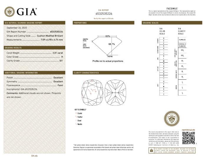 | 2.01 | Cushion | H | SI1 | GIA | 68.7 | 63 | 7.59x6.90x4.74 | Contact Vendor |