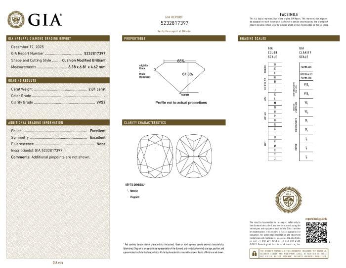 | 2.01 | Cushion | J | VVS2 | GIA | 67.8 | 65 | 8.38x6.81x4.62 | Contact Vendor |