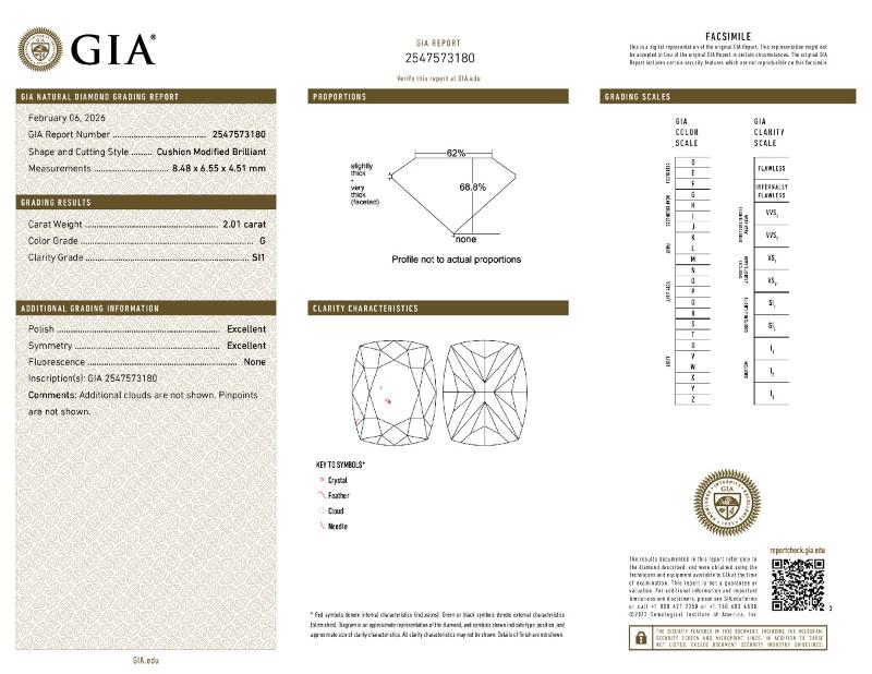 | 2.01 | Cushion | G | SI1 | GIA | 68.8 | 62 | 8.48x6.55x4.51 | Contact Vendor |