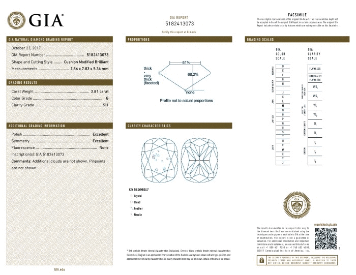 | 2.81 | Cushion | G | SI1 | GIA | 68.2 | 61 | 7.86x7.83x5.34 | Contact Vendor |