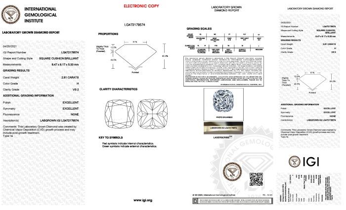 | 2.81 | Cushion | G | VS1 | IGI | 68.5 | 62 | 8.04x8.03x5.50 | Contact Vendor |