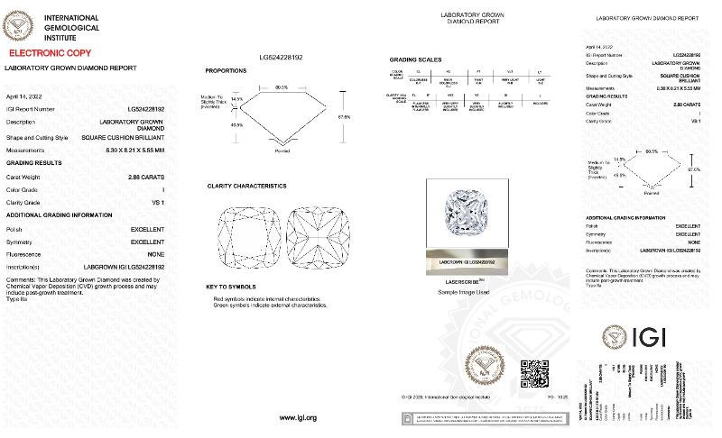 | 2.88 | Cushion | I | VS1 | IGI | 67.6 | 61 | 8.30x8.21x5.55 | Contact Vendor |