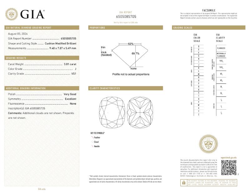 | 3.01 | Cushion | J | VS1 | GIA | 69.7 | 62 | 9.48x7.87x5.49 | Contact Vendor |