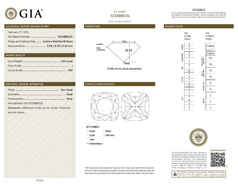 | 3.02 | Cushion | I | VS2 | GIA | 68.2 | 70 | 8.38x8.30x5.66 | Contact Vendor |