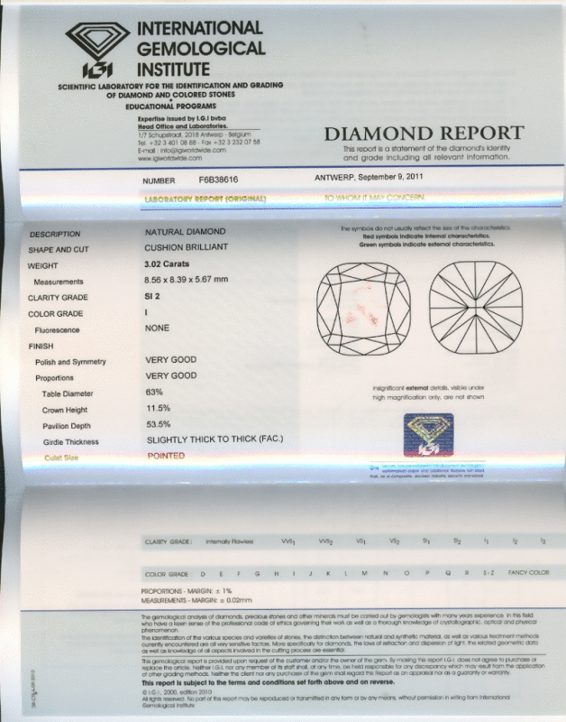 | 3.02 | Cushion | I | SI2 | IGI | 67.7 | 63 | 8.56x8.39x5.67 | Contact Vendor |