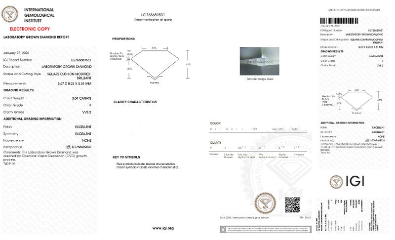 | 3.04 | Cushion | G | VVS2 | IGI | 63.6 | 62 | 8.54x8.52x5.42 | Contact Vendor |