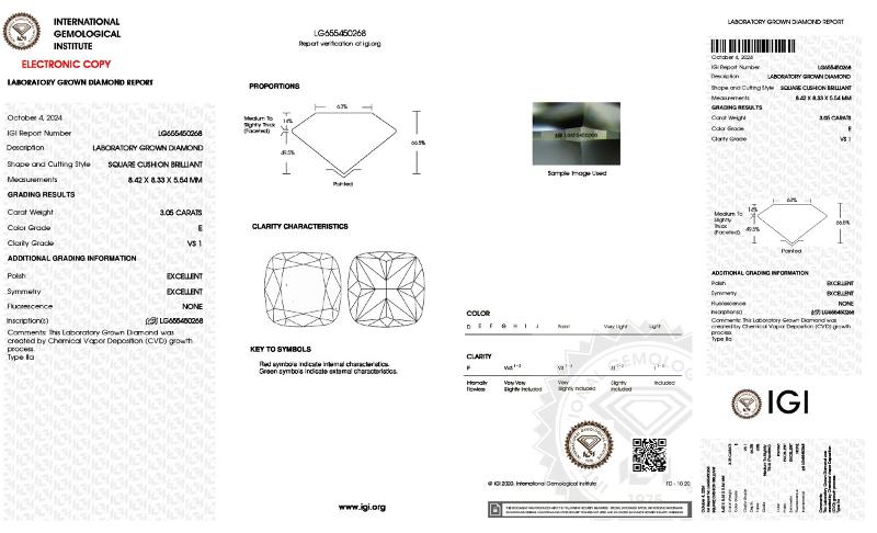 | 3.05 | Cushion | E | VS1 | IGI | 66.5 | 63 | 8.42x8.33x5.54 | Contact Vendor |