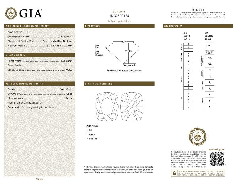 | 3.05 | Cushion | H | VVS2 | GIA | 81.9 | 60 | 8.26x7.56x6.20 | Contact Vendor |