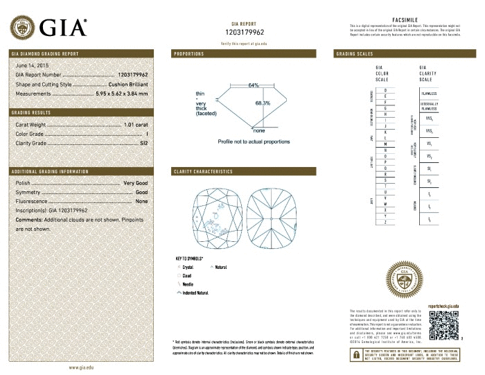 | 1.01 | Cushion Brilliant | K | SI1 | GIA | 68.5 | 63 | 5.87x5.56x3.81 | Contact Vendor |