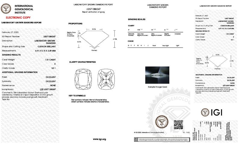 | 1.01 | Cushion Brilliant | E | VS1 | IGI | 67.8 | 60 | 6.91x5.15x3.49 | Contact Vendor |