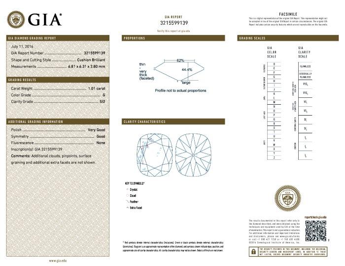 | 1.01 | Cushion Brilliant | G | SI2 | GIA | 44.4 | 62 | 6.81x6.31x2.80 | Contact Vendor |