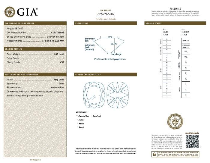 | 1.01 | Cushion Brilliant | J | VS2 | GIA | 56.3 | 58 | 6.78x5.83x3.28 | Contact Vendor |