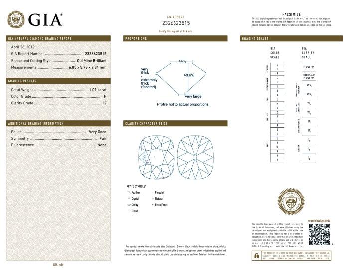 | 1.01 | Cushion Brilliant | H | I2 | GIA | 48.6 | 44 | 6.85x5.78x2.81 | Contact Vendor |
