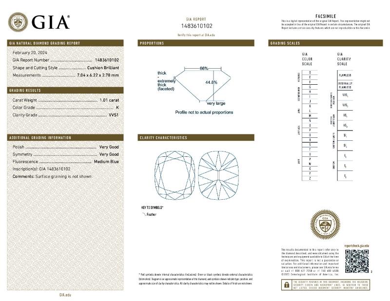 | 1.01 | Cushion Brilliant | K | VVS1 | GIA | 44.8 | 66 | 7.04x6.22x2.78 | Contact Vendor |