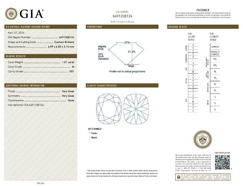 | 1.01 | Cushion Brilliant | M | VS1 | GIA | 51.2 | 57 | 6.99x6.05x3.10 | Contact Vendor |