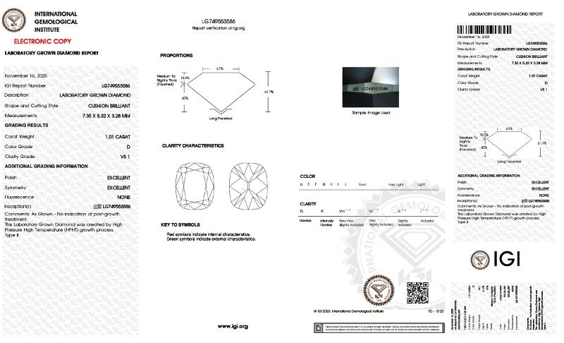 | 1.01 | Cushion Brilliant | Fancy | VS1 | IGI | 61.3 | 64 | 7.72x5.01x3.07 | Contact Vendor |