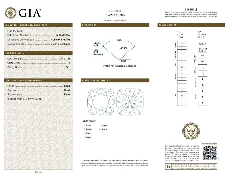 | 1.01 | Cushion Brilliant | J | SI1 | GIA | 45.4 | 59 | 6.70x6.61x3.00 | Contact Vendor |