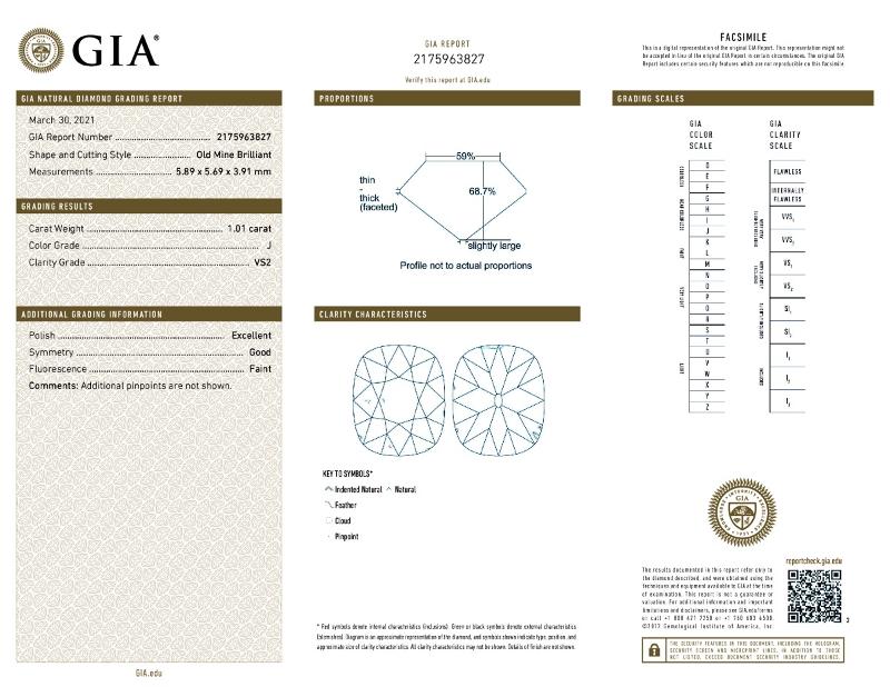 | 1.01 | Cushion Brilliant | J | VS2 | GIA | 68.7 | 59 | 5.89x5.69x3.91 | Contact Vendor |