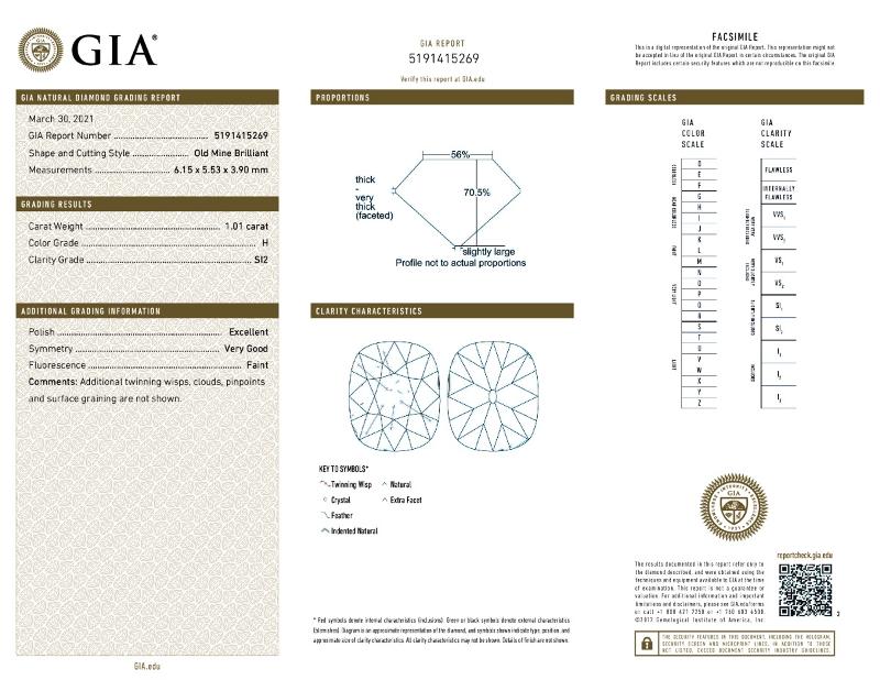 | 1.01 | Cushion Brilliant | H | SI2 | GIA | 70.5 | 56 | 6.15x5.53x3.90 | Contact Vendor |