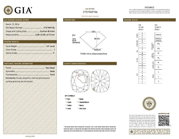 | 1.01 | Cushion Brilliant | F | SI1 | GIA | 63.1 | 69 | 8.02x5.30x3.35 | Contact Vendor |