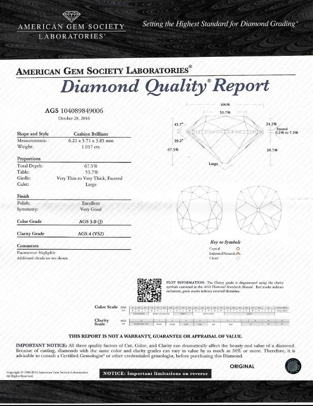 | 1.01 | Cushion Brilliant | J | VS2 | AGS | 67.5 | 54 | 6.21x5.71x3.85 | Contact Vendor |