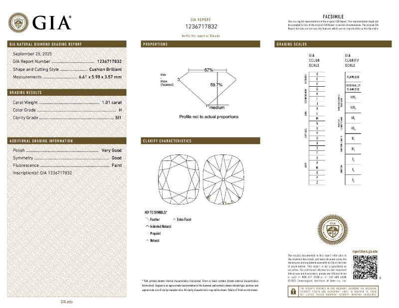 | 1.01 | Cushion Brilliant | H | SI1 | GIA | 59.7 | 67 | 6.61x5.98x3.57 | Contact Vendor |