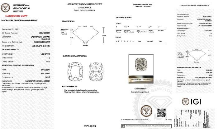 | 1.02 | Cushion Brilliant | D | VS1 | IGI | 68.9 | 60 | 6.78x5.27x3.63 | Contact Vendor |