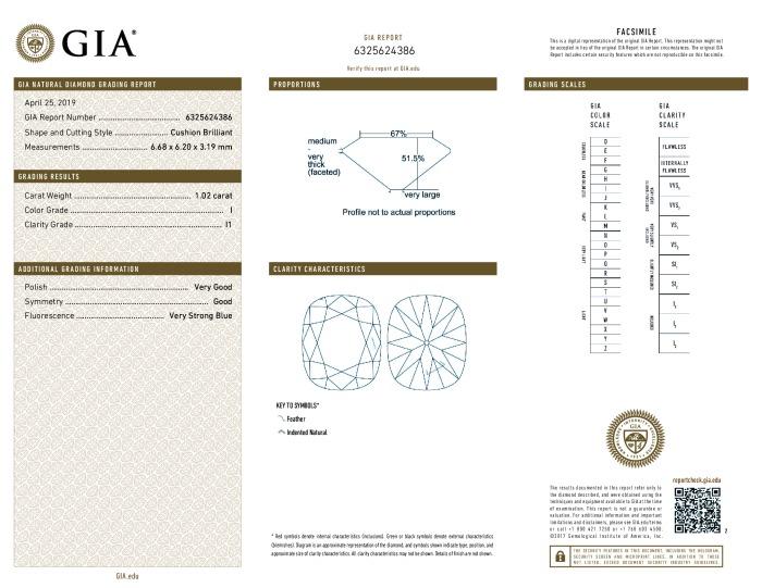 | 1.02 | Cushion Brilliant | I | I1 | GIA | 51.5 | 67 | 6.68x6.20x3.19 | Contact Vendor |