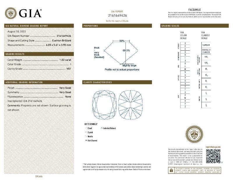 | 1.02 | Cushion Brilliant | I | VS1 | GIA | 69.5 | 50 | 6.05x5.61x3.90 | Contact Vendor |