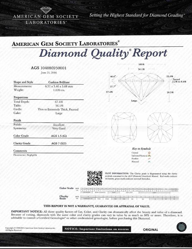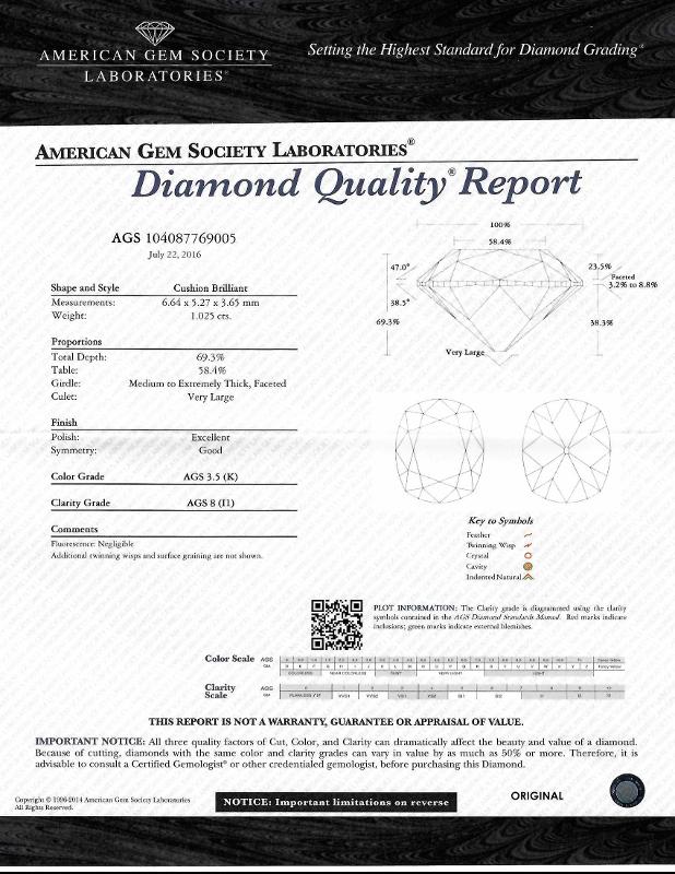| 1.02 | Cushion Brilliant | K | I1 | AGS | 69.3 | 58 | 6.64x5.27x3.65 | Contact Vendor |