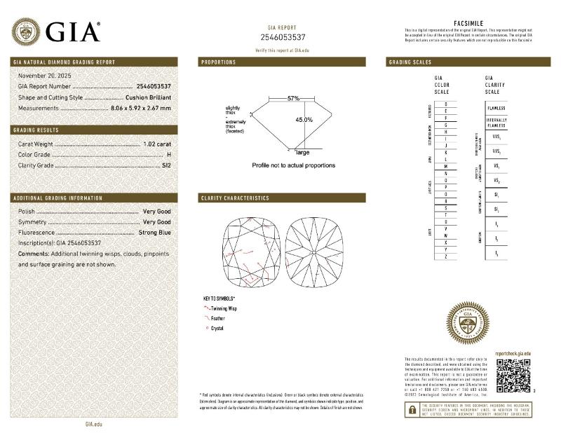 | 1.02 | Cushion Brilliant | H | SI2 | GIA | 45.0 | 57 | 8.06x5.92x2.67 | Contact Vendor |