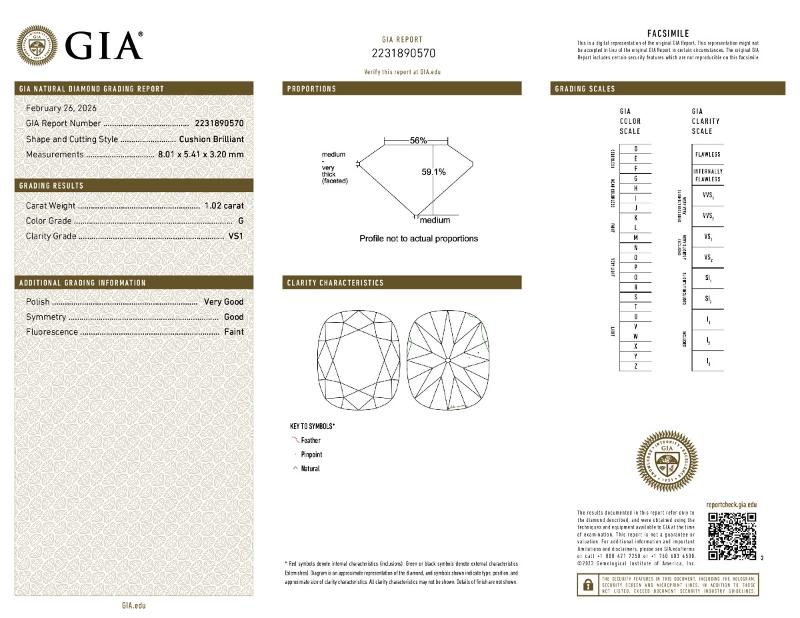 | 1.02 | Cushion Brilliant | G | VS1 | GIA | 59.1 | 56 | 8.01x5.41x3.20 | Contact Vendor |