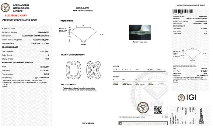 | 1.23 | Cushion Brilliant | E | VS1 | IGI | 66.5 | 57 | 7.59x5.58x3.71 | Contact Vendor |