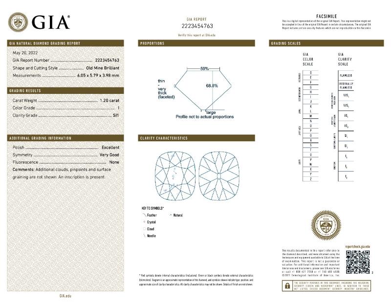 | 1.20 | Cushion Brilliant | I | SI1 | GIA | 68.8 | 59 | 6.05x5.79x3.98 | Contact Vendor |
