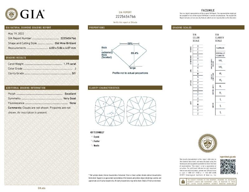 | 1.19 | Cushion Brilliant | J | SI1 | GIA | 69.4 | 56 | 6.00x5.86x4.07 | Contact Vendor |