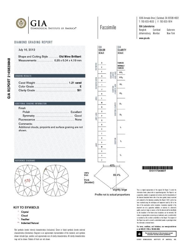 | 1.21 | Cushion Brilliant | E | SI1 | GIA | 69.4 | 49 | 6.35x6.04x4.19 | Contact Vendor |