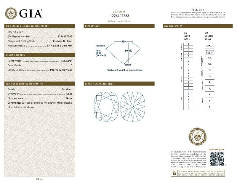 | 1.25 | Cushion Brilliant | D | IF | GIA | 50.6 | 55 | 8.47x5.98x3.03 | Contact Vendor |