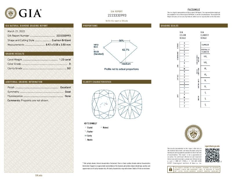 | 1.23 | Cushion Brilliant | D | SI2 | GIA | 62.7 | 56 | 8.92x5.58x3.50 | Contact Vendor |
