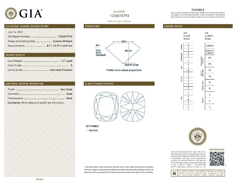 | 1.21 | Cushion Brilliant | D | IF | GIA | 66.4 | 58 | 8.11x5.27x3.49 | Contact Vendor |
