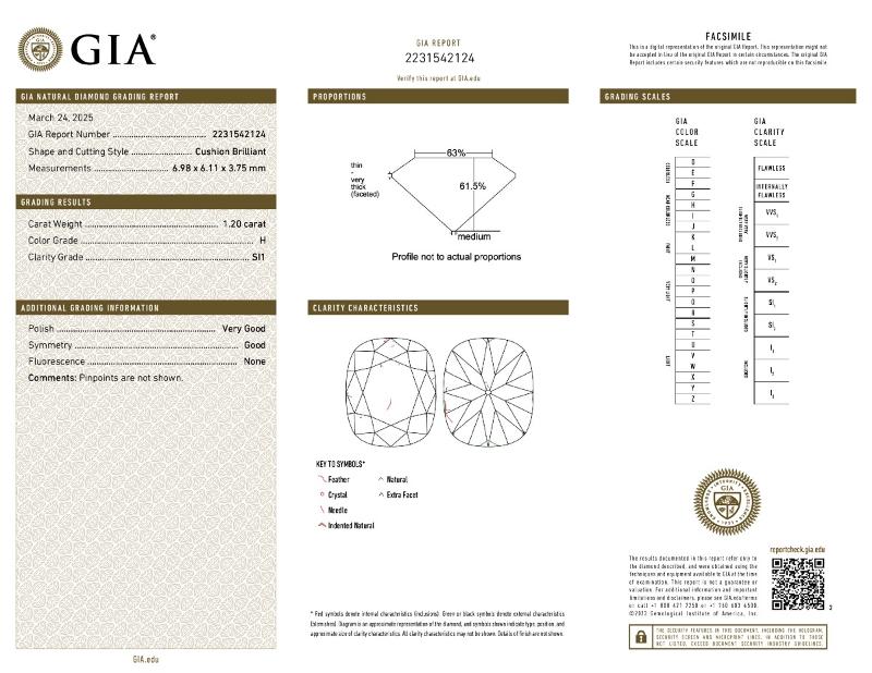 | 1.20 | Cushion Brilliant | H | SI1 | GIA | 61.5 | 63 | 6.98x6.11x3.75 | Contact Vendor |