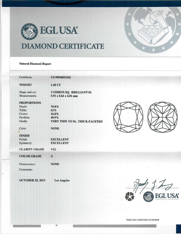 | 1.20 | Cushion Brilliant | G | VS2 | EGLUSA | 70.8 | 62 | 5.91x5.66x4.01 | Contact Vendor |