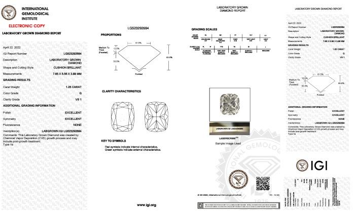 | 1.25 | Cushion Brilliant | G | VS1 | IGI | 69.8 | 62 | 7.65x5.56x3.88 | Contact Vendor |